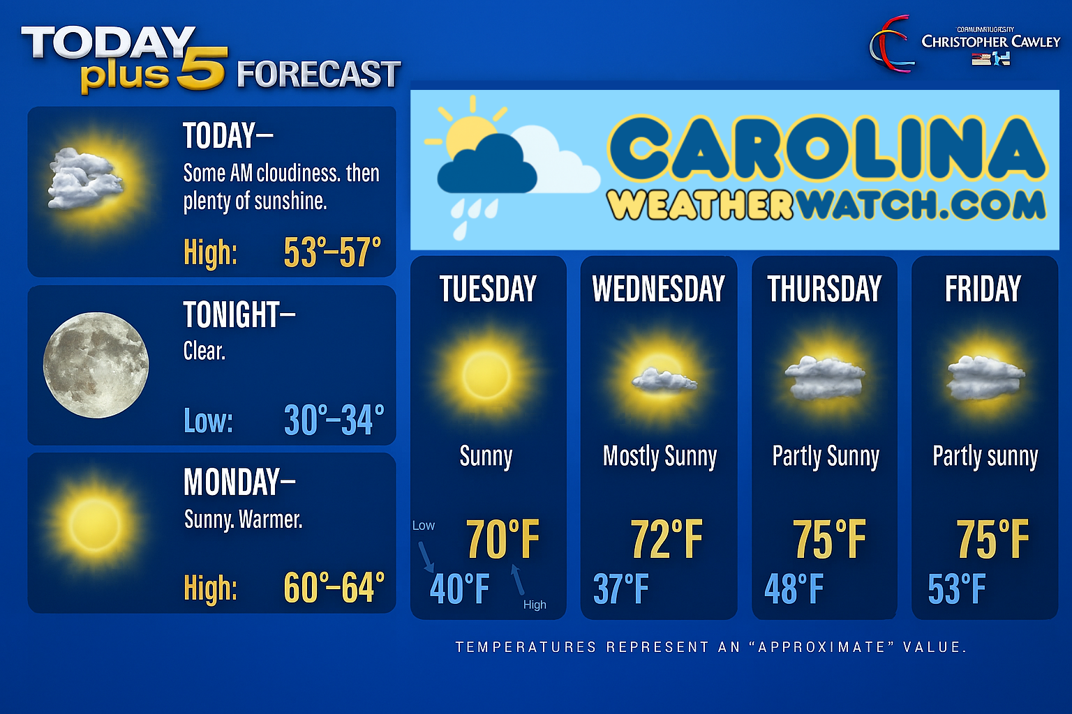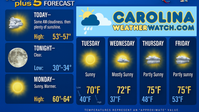 Here is your Carolina Weather Watch Today-plus-Five Forecast: