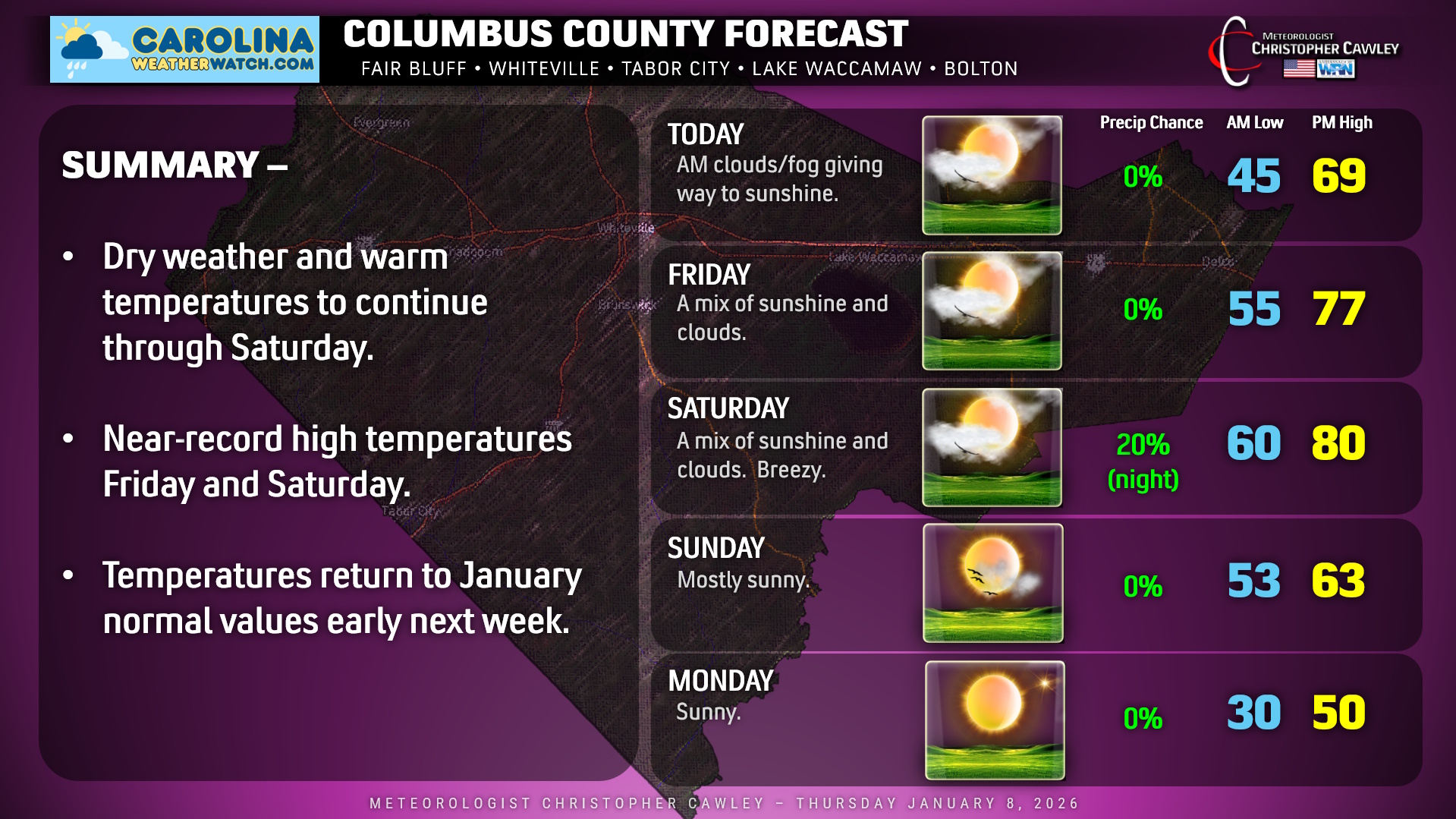 Greetings and welcome to the Columbus County Weather Update for Thursday January 8, 2026.